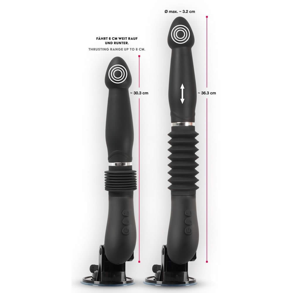 Nyd kraftfulde stød på op til 6 cm, 3 thrust-hastigheder og 7 vibrationsmønstre – alt sammen styret med en fjernbetjening. Den bløde overflade og justerbare sugekop sikrer intens, håndfri leg. Genopladelig og med rejselås for diskret opbevaring.